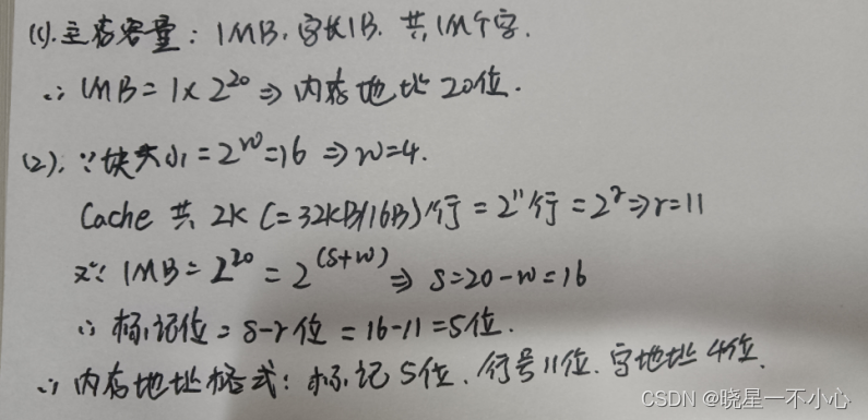 20. (填空题, 6分)主存容量1MB,字长1B,块大小16B,Cache容量32KB,若Cache采用直接映射方式,主存地址____位,内存地址的格式为:标记____位,行号____位,字地址____位。