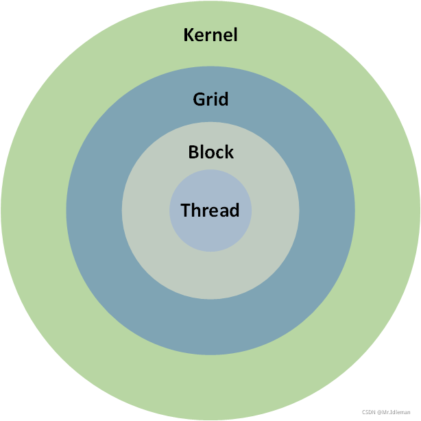 CUDA的线程模型结构如下图所示,分别包括Thread(单个线程)、Thread Block(线程块)、Grid(线程网格)、Kernel(核心):