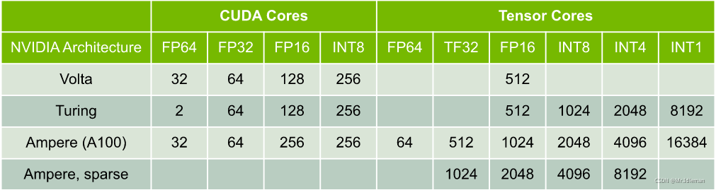 下表显示了 NVIDIA 最近的 GPU 架构上针对每个 SM 单位时钟内的乘加运算数量。每个乘加包括两个操作,因此可以将表中的吞吐量乘以 2 以获得每个时钟的 FLOP 计数。再将这些乘以 SM 的数量和 SM 时钟速率可以获得 GPU 的 FLOPS 速率: