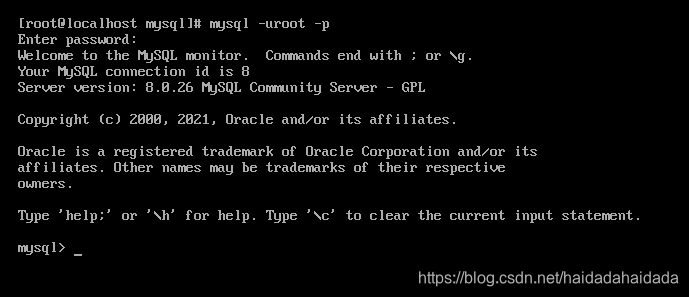 7、通过命令 mysql -uroot -p 并 回车 进入数据库登录界面。输入刚刚查到的密码,进行数据库的登陆(MySQL 的登陆密码是不显示的)