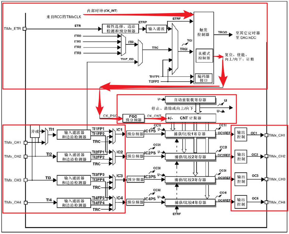 TIM不仅具备基本的定时中断功能,而且还包括内外时钟源选择,输入捕获,输出比较,编码器接口,主从触发模式等多种功能。