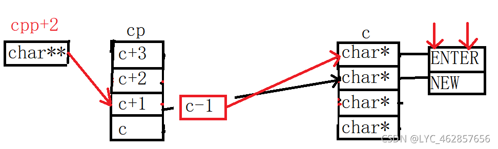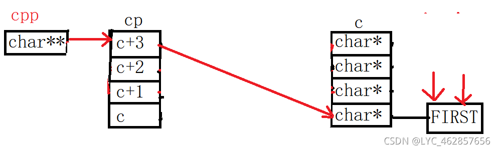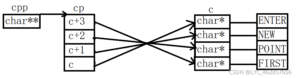 - char*c[],charcp[],char*cpp这三者之间的指向关系如下: