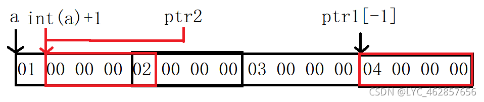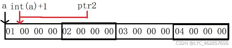 - ptr2是一个整形指针,(int)a + 1中a表示首元素的地址,再将其强制类型转换问int,它加一就是加一(地址加1),相当于向后偏移了一个字节,在内存中一个字节给一个地址,如:0x0012ff44-->int+1-->0x0012ff45