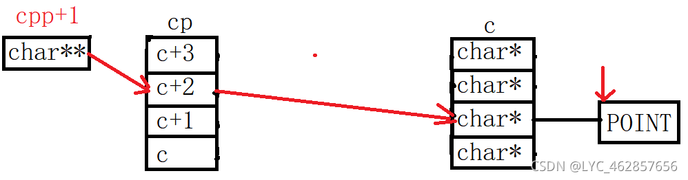 - ++cpp表示先cpp+1,再解引用,指向c+2的地址,再解引用,指向P的地址,结果为POINT