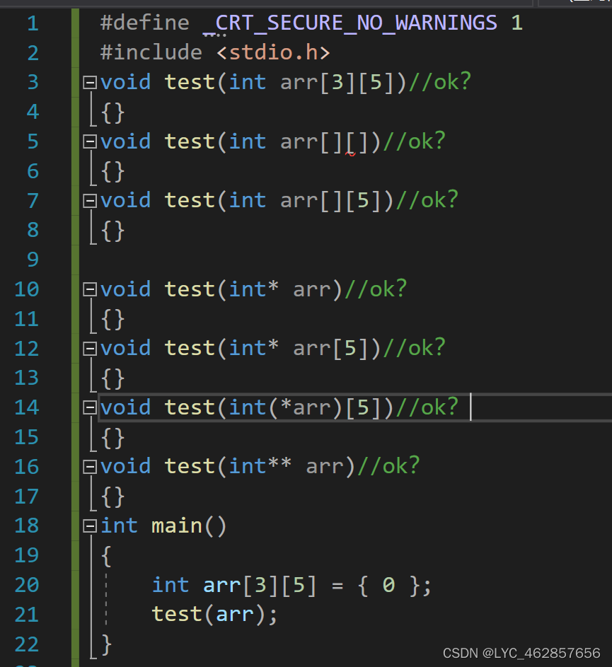 - 第五个test错误,不能用一级指针数组接收,用数组接收,只能用二维数组,