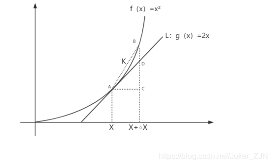 意味着当△x足够小的时候L线可以代替函数图像和K线被用于计算,即A、B两点间的斜率可以近似等于A点的斜率,于是有: